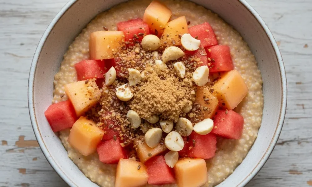Heerlijke gekookte sorghum als heerlijke ontbijt bowl. Je maakt dit darmproof ontbijtje lekker romig door deze te doordrenken met geitenmelk. Voor extra smaak maak je deze bowl nog gezonder door de eidooiers, verse blokjes watermeloen en cantaloupe, krokante macadamia-noten en lijnzaad, afgewerkt met kokossuiker en kokosrasp. Een hele mond vol, maar ook echt een heerlijke mond vol smaak. Heerlijk verfrissend, zonder je lichaam te veel af te koelen en last te krijgen van je darmen. Geen fan van meloen? Switch je fruit naar rood fruit, ook heerlijk!